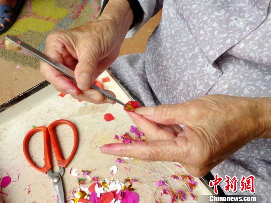 今年80岁的陈亚晓,自幼就学会做头花。尽管做头花赚不了多少钱,但她仍每天坚持做。