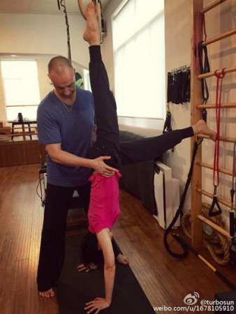 中新网6月15日电 昨日,孙俪在微博晒出健身时的照片,并称:“生命在于运动。”照片中,孙俪穿着玫红色上衣,黑色运动裤,身姿矫健,摆出武打电影中的高踢腿动作。此外,孙俪还在外教指导下练习倒立,侧撑等动作。