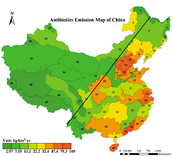中国在抗生素的使用上,可划分成明显的东部和西部两个部分,东部的抗生素排放量强度是西部的6倍以上。