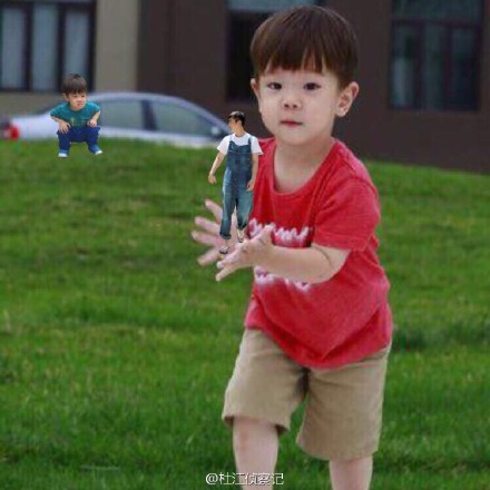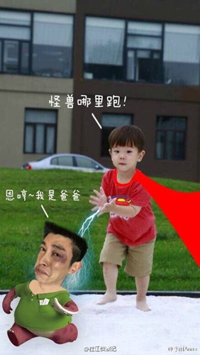 照片中,不仅有嗯哼被PS成月野兔打小怪兽的造型;还有他双手捧起,手心里托着爸爸的搞笑图片;以及嗯哼化身超人称爸爸是“怪兽”的样子。