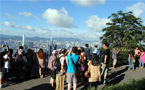 在香港太平山顶游玩的游客