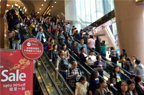 羊年春节期间,人们在香港铜锣湾一家商场乘坐自动扶梯