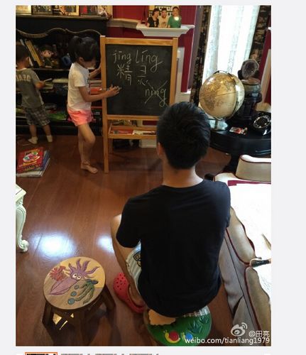 中新网7月10日电 昨晚,田亮通过微博晒出一组女儿森碟教其普通话的照片。照片中,森碟在小黑板上写下精灵两个字,并注上拼音,认真教导父亲普通话。