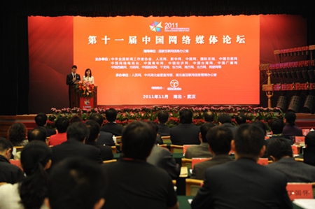 人民网承办的第十一届中国网络媒体论坛在湖北武汉举行,本届论坛以“推动网络媒体新跨越 促进网络文化大繁荣”为主题,来自全国近百家网络媒体的代表、政府官员、相关专家学者近300人参加了论坛,共同探讨推动网络媒体发展、促进网络文化繁荣之道。