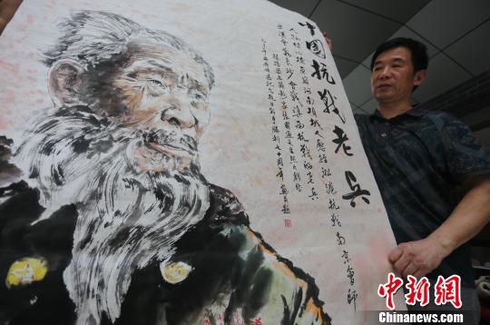 中新网郑州7月25日电(杨正华)为纪念中国抗战胜利70周年,历经2个多月的构思创作,河南画家蒋伟先生为逝去的有着“中国抗战活化石”之称的河南藉113岁抗战老兵付心德绘制的巨幅画像《中国抗战老兵》完成。