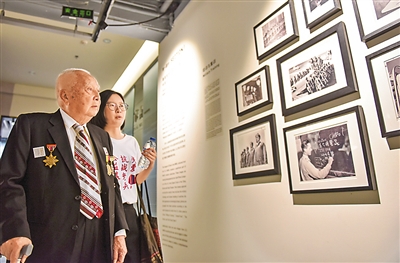 8月9日,“国家记忆——越众历史影像馆藏海外收集抗战影像展”在深圳越众历史影像馆开幕,展出该影像馆近年从海外收集的大量抗战影像,其中包括美国国家档案馆等机构收集的中国抗战影像资料、中缅印战场研究者戈叔亚寻访历史足迹、海外华人在二战期间报效祖国的私藏家族影像以及抗战动态影像等。图为志愿者向抗战老兵介绍展览。
