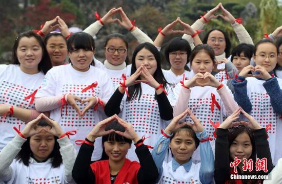 11月30日,来自南京农业大学红十字会学生分会的百余名大学生志愿者来到玄武湖等地,举办以“行动起来,向‘零’艾滋迈进”为主题的公益活动,通过与贴有“我是艾滋病患者,抱抱我好吗”字样的大熊相互拥抱、舞动神曲“小苹果”、发放防艾红丝带等互动活动,向民众宣传艾滋病防治知识,呼吁关爱艾滋病人。12月1日是第27个“世界艾滋病日”,今年世界艾滋病日活动主题仍为“行动起来,向‘零’艾滋迈进”,副标题为“凝聚力量,攻坚克难,控制艾滋”。泱波 摄