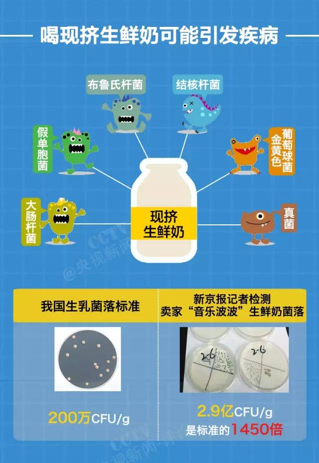 现挤生鲜奶没经过任何消毒处理,产奶的奶牛是否健康、是否检疫、运输过程有没有被污染等都难以做到完全追溯。而不少商家所针对的消费者,正是儿童、老人、孕妇这类免疫力低的人群,食用后被病原菌感染的风险更大。最近,新京报记者做了一项实验,结果显示,现挤生鲜奶菌落总数最高竟然超标1450倍!