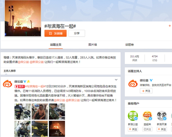 微博上,公益话题#与滨海在一起#下面,各类捐款信息和救助信息不断更新。芭莎慈善公益基金、汽车之家李想、香港娱乐圈知名人士陈岚各捐款100万元,《捉妖记》出品方“安乐电影”、聚美优品陈欧各捐款500万元,向牺牲的消防战士家属表达敬意和哀悼之情。