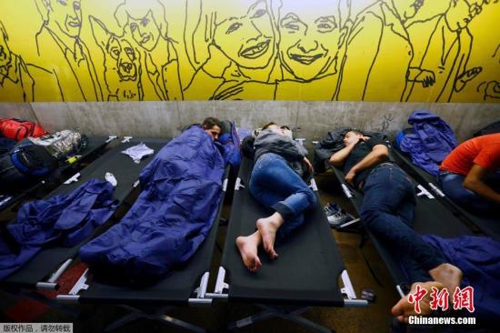 9月13日,在奥地利萨尔茨堡火车站,难民在一处地下停车场休息。当日,奥地利铁路公司宣布,应德国方面要求,由奥地利开往德国的全部列车自当地时间17时开始停运12小时。目前,上千名难民因此滞留萨尔茨堡火车站,萨尔茨堡方面已将难民安置在一处地下停车场。