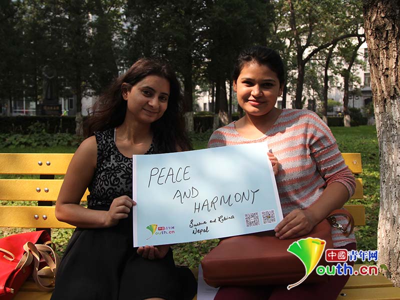 来自尼泊尔的两个女生Susme和Rabina,用“和平”和“和谐”表达对世界和平的心声。中国青年网 通讯员 姜润邈 摄