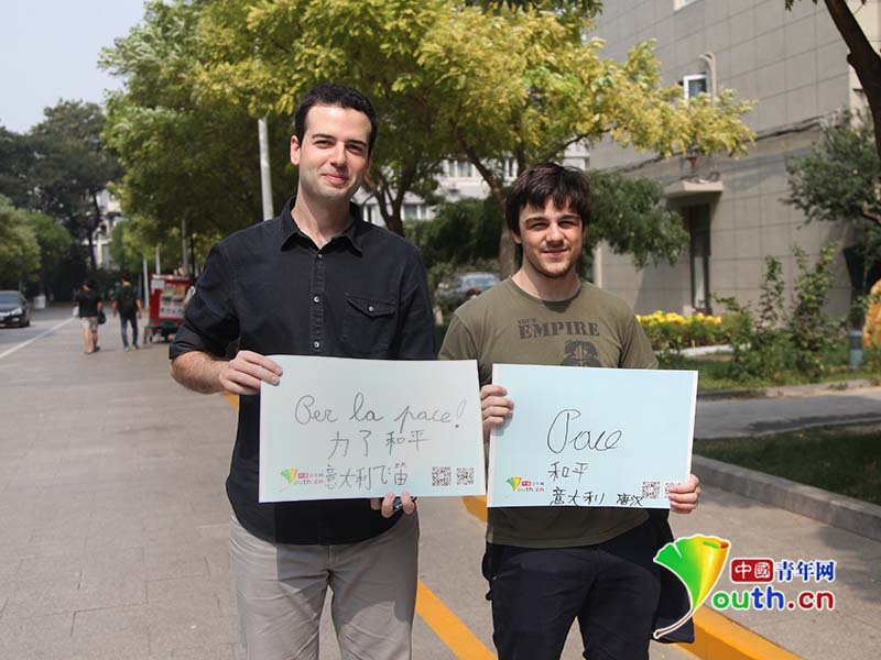 飞迪来自意大利,从小在中国长大,中文流利,汉字流畅。他和他的朋友唐汉分别用英文和中文写下“和平”与“为了和平”的字样。中国青年网 通讯员 姜润邈 摄