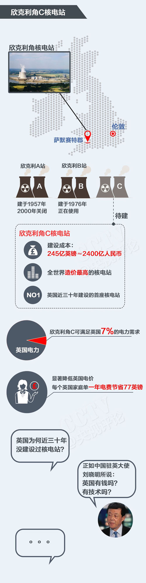 此次习主席访英期间,两国还将签署超过300亿英镑的经贸投资协议,其中,最引人注目的就是中国参与建设的英国西南部欣克利角C核电项目,仅这个项目的合同金额就达到了245亿英镑。