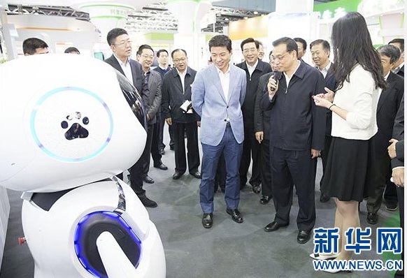 10月19日,中共中央政治局常委、国务院总理李克强在北京出席首届“全国大众创业万众创新活动周”,并考察主题展区。这是李克强在与百度公司自主研发的机器人交谈。图片来源:新华社