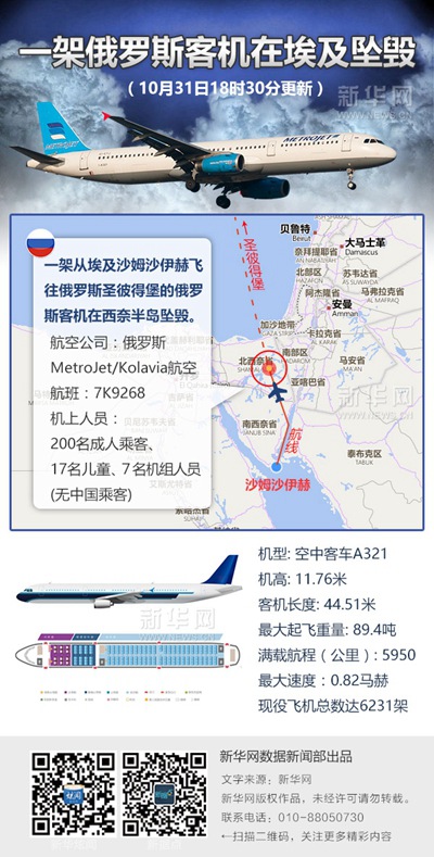 一架从埃及沙姆沙伊赫飞往俄罗斯圣彼得堡的俄罗斯客机31日清晨起飞后不久坠毁于埃及西奈半岛阿里什地区南部的哈桑纳山区。机上共有217名乘客和7名机组人员,乘客多为俄罗斯游客。俄罗斯驻埃及大使馆发布消息确认,机上乘客和机组人员无一生还。