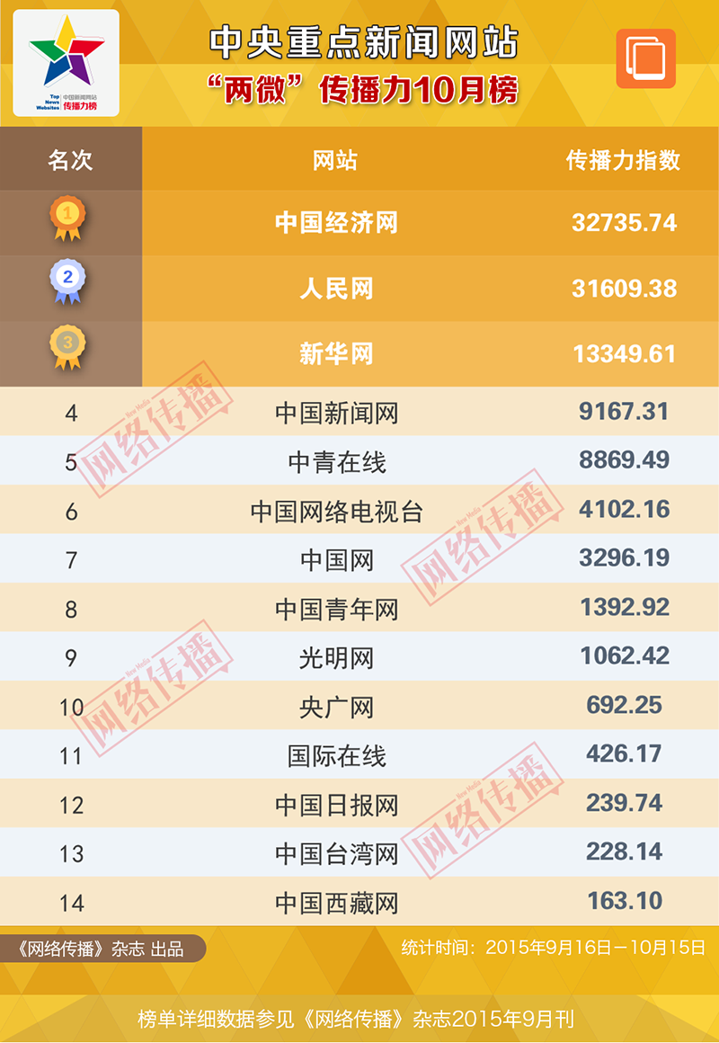 2015年10月中央重点新闻网站"两微"传播力排行榜