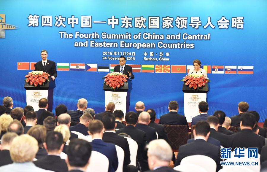 新华网南京11月24日电(记者王慧慧、王聪)国务院总理李克强24日晚在苏州太湖国际会议中心出席第四次中国-中东欧国家领导人会晤后,与前次会晤主办国塞尔维亚总理武契奇、下次会晤主办国拉脱维亚总理斯特劳尤马共同会见记者,介绍会晤成果。