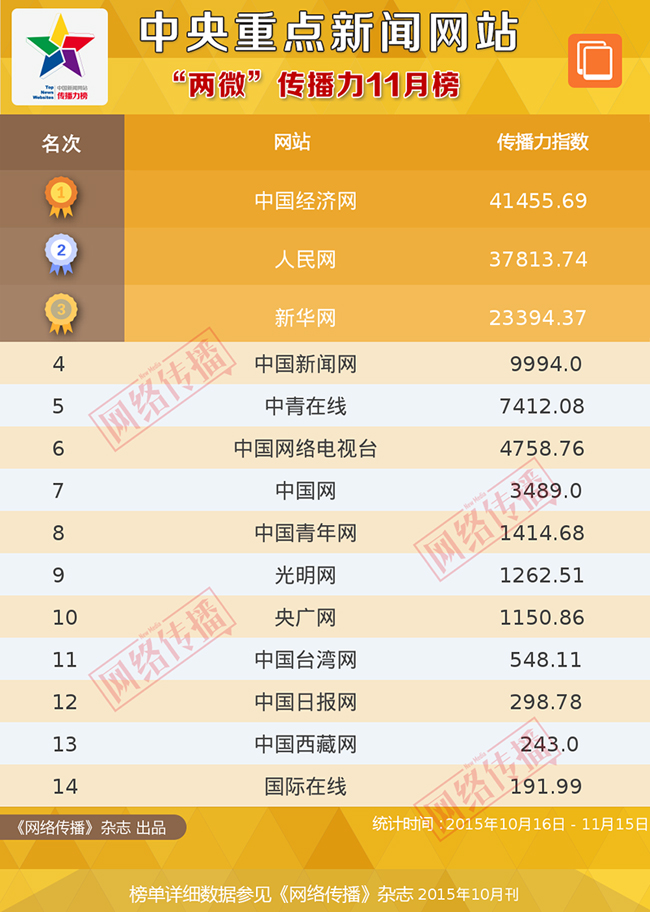2015年11月中央重点新闻网站"两微"传播力排行榜