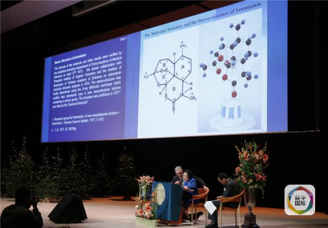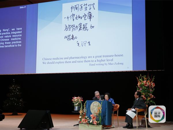 卡罗琳医学院大门口迎风飘扬着中国、日本、美国和瑞典国旗。早在讲座开始前2小时,就已排起了入场长队,千人礼堂座无虚席,所有人都期盼着聆听“科研的故事”。身着宝蓝色套裙的屠呦呦和另两位该奖得主大村智及威廉·坎贝尔缓缓步入礼堂,一同与家人就座。在大村智和坎贝尔分别进行演讲后,屠呦呦用中文进行了主题演讲《青蒿素——传统中医给世界的一份礼物》。