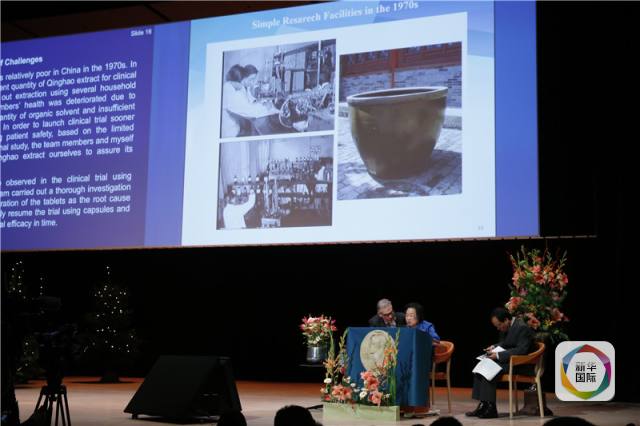 屠呦呦身后的大屏上展示了许多老照片:中国古籍、实验用品、手写的临床试验治愈率、研究报告文献等都再现了中国科研团队在传统中医中寻找宝藏,经与现代科学技术相结合,最终治病救人、造福人类的过程。