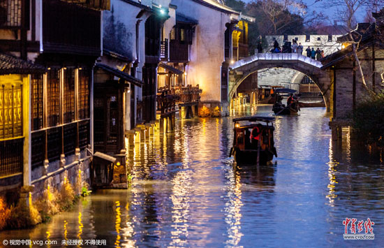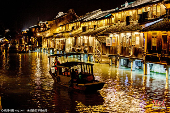 浙江省桐乡市乌镇西栅景区火树银花不夜天,游客游览购物、摩肩接踵,感受水乡古镇的夜晚风情。(图片作者:王子瑞)