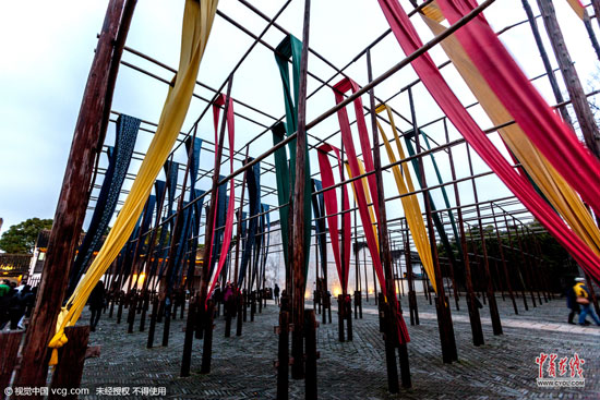 2014年2月3日,浙江省桐乡市乌镇西栅景区内草木本色染坊“宏源泰”染坊的晒布场地。(图片作者:王子瑞)