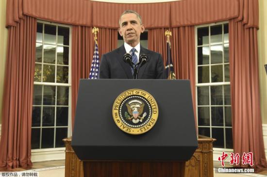 当地时间2015年12月6日,美国华盛顿,美国总统奥巴马于白宫椭圆办公室发布重要演说,对南加大规模枪击案发生后美国应对恐怖威胁以及如何打击极端组织做出说明。