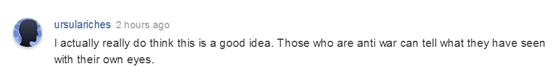 网友@ursulariches称:“我认为这个想法真得很棒,反战的人们可以将旅途亲眼所见告诉其他人。”