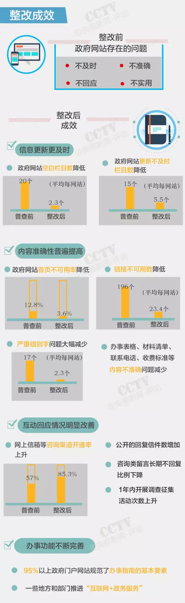 普查中发现的问题,通过整改,也取得了一定的成效。以前很多政府网站存在的“四不”问题得到解决,基本消除了 “僵尸”、“睡眠”问题。