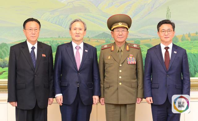 这是金养建(左一)于2015年8月25日出席韩朝高级别对话时与其他韩朝官员合影的资料照片。
