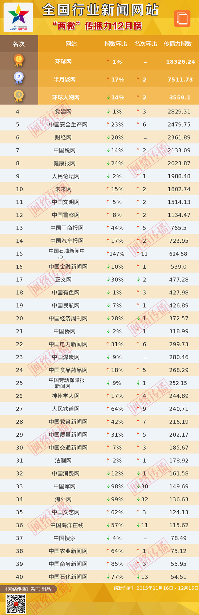 2015年12月全国行业新闻网站“两微”传传播力排行榜