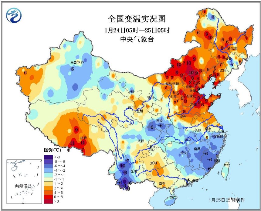 人民网北京1月25日电 据中央气象台网站消息,由于寒潮带来的强降温区范围明显缩小,今晨中央气象台解除了寒潮橙色预警。今天早晨较昨天早晨,我国北方大部地区气温明显回升,内蒙古地区中东部、华北大部、黄淮北部等地升温6~9℃,而江南大部、四川西部和北部、云南中西部等地降温3~6℃,云南西部局地气温下降8~10℃。预计,从明天开始,我国南方大部地区气温将明显回升,27日以后最低气温0℃线将在北移至江淮一带。