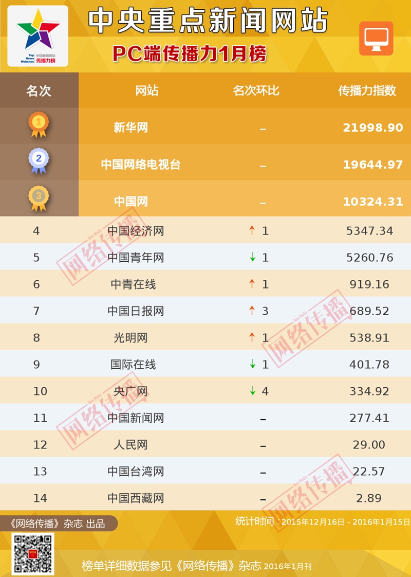 2016年1月中央重点新闻网站PC端传播力排行榜
