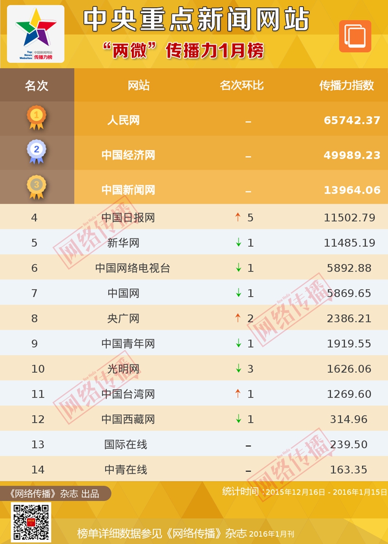 2016年1月中央重点新闻网站"两微"传播力排行榜