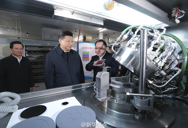 习近平来到南昌大学国家硅基LED工程技术研究中心,走进实验室,观看产品展示,听取南昌光谷建设汇报。江风益团队19年磨一剑,开辟了LED第三条技术路线,实现了产业化,LED产业前景广阔,总书记看了十分高兴。他强调,我国发展必须依靠创新。掌握核心技术的过程很艰难,但这条道路必须走。这个新兴产业大有可为,我对你们寄予厚望。