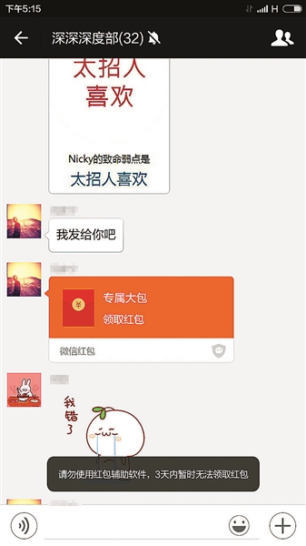 更严重的情况则出现在次日,当又有微信红包出现时,北青报记者尝试点开却并没有成功,在微信下端显示出“请勿使用红包辅助软件,3天内暂时无法领取红包”的字样。