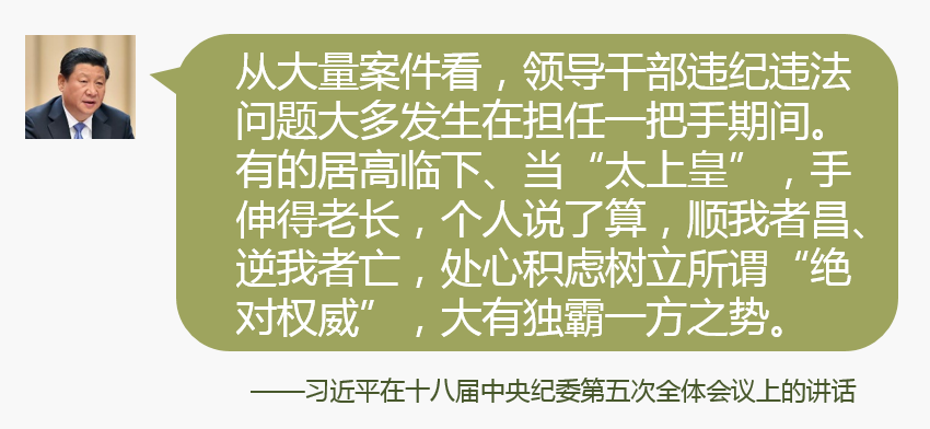 从大量案件看,领导干部违纪违法问题大多发生在担任一把手期间。有的践踏民主集中制,搞家长制、一言堂,居高临下、当“太上皇”,手伸得老长,个人说了算,顺我者昌、逆我者亡,处心积虑树立所谓“绝对权威”,大有独霸一方之势。有的人被查处后讲:“我的一个批示可以让一个企业获得巨大利益,可以让亲朋好友获取好处,可以让一个人改变处境,可以办事顺利、一路绿灯。”有的人就反省说,省委领导对地市一把手多是给政策,多是鼓励,而少有严格要求,少有监督;同级和下级根本不敢监督一把手,这就造成一把手权力失控。