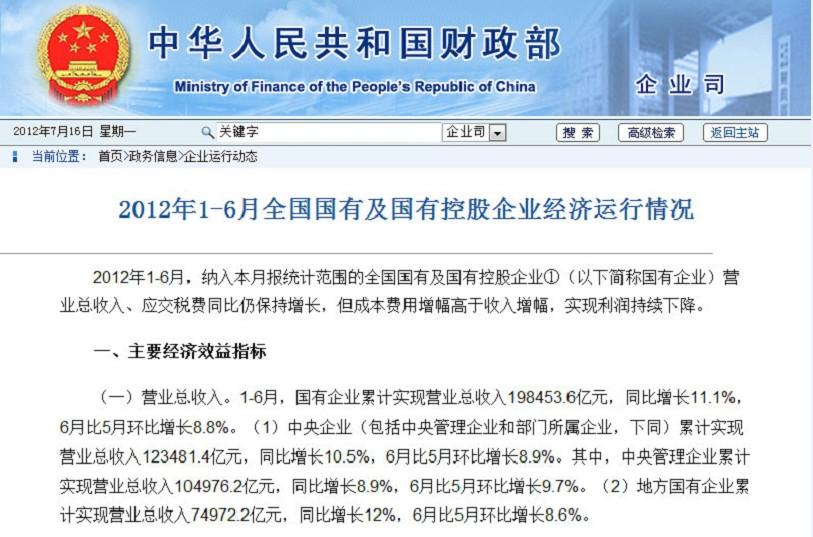 ²ÆÕþ²¿·¢²¼2012Äê1-6ÔÂÈ«¹ú¹úÓм°¹úÓÐ¿Ø¹ÉÆóÒµ¾¼ÃÔËÐÐÇé¿ö¡£