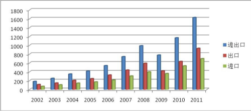 ¡¡¡¡(Ò»)¶ÔÍâóÒ×È¡µÃÐÂÍ»ÆÆ¡£10ÄêÀ´£¬Öв¿µØÇø½ø³ö¿Ú×ܶî´Ó2002ÄêµÄ182.2ÒÚÃÀÔªÔöÖÁ2011ÄêµÄ1628.2ÒÚÃÀÔª£¬Ôö³¤9±¶£¬Äê¾ùÔö³¤27.7%£¬Õ¼È«¹ú±ÈÖØÓÉ2.9%ÔöÖÁ4.5%£»ÆäÖУ¬³ö¿Ú´Ó111.8ÒÚÃÀÔªÔöÖÁ930.6ÒÚÃÀÔª£¬Ôö³¤8.3±¶£¬Äê¾ùÔö³¤26.5%£»½ø¿Ú´Ó70.4ÒÚÃÀÔªÔöÖÁ697.6ÒÚÃÀÔª£¬Ôö³¤10±¶£¬Äê¾ùÔö³¤29%¡£