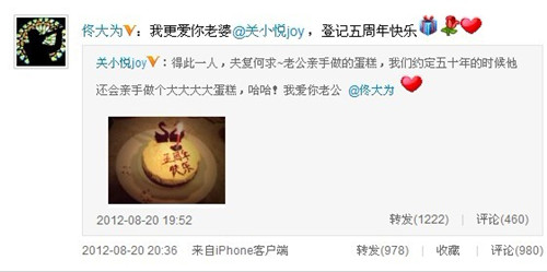 ¡¡¡¡Õâ¸ö±¥º¬×ÅÙ¡´óΪ°®ÆÞÇéÉîµÄµ°¸â¸Ð¶¯µÃ¹ØÔÃÈ̲»×¡ÔÚ΢²©ÉϹ«¿ªÏòÙ¡´óΪʾ°®µÀ£¬¡°µÃ´ËÒ»ÈË£¬·ò¸´ºÎÇó¡£ÀϹ«Ç×ÊÖ×öµÄµ°¸â£¬ÎÒÃÇÔ¼¶¨ÎåÊ®ÄêµÄʱºòËû»¹»áÇ×ÊÖ×ö¸ö´ó´ó´ó´óµ°¸â£¬¹þ¹þ£¡ÎÒ°®ÄãÀϹ«£¡¡±Ëæºó£¬Ù¡´óΪҲÔÚ΢²©ÉÏÓë°®ÆÞ»¥¶¯µÀ£¬¡°ÎÒ¸ü°®ÄãÀÏÆÅ£¬µÇ¼ÇÎåÖÜÄê¿ìÀÖ£¡¡±