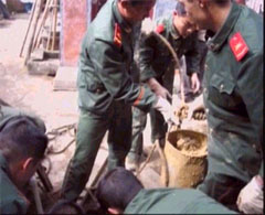 约过了10多分钟,吕庆峰忽然听到坐在井边的马排长大喊:"德斌,快提!"吕庆峰还没明白是怎么回事,只见在井边拉着拴在井下挖土战士身上绳子的班长王德斌奋力往上一提,在井下挖土的战士被提上来的一瞬间,井壁上的土石又"轰"的一下垮塌了,挖土战士刚才所在的位置顷刻就被泥土给埋没了。这时吕庆峰才明白过来:差一点这个战士就被垮塌的泥土砸倒埋在井里了。