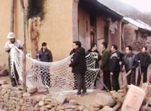 眼见看热闹的村民们身处险境,一旁持枪的警方人员问任建设:是否开枪?任建设没言声:枪声一响若没打中,豹子受惊就会大祸临头;倘若击中要害部位,就会伤及豹子性命,也是不愿看到的结局。任建设正犹豫,刚才还活蹦乱蹿的豹子突然间神情异变,只见它靠着土壕的南边围墙,慢慢地在墙根边伏下了身子,那样子好像是精神不振、疲倦至极,接着就不动弹了。这是麻醉药发挥了效力。但任建设不敢马上过去靠近它,又耐心地观察了一会儿,认定它确实已被麻醉了,才和小潘用竹竿挑着网子慢慢靠过去。就在任建设这边的网子先落下去即将罩在豹子身上时,冷不防豹子呼地一下扬起前肢把网向下一拽,压到它的肚子底下……