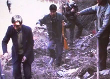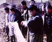 任建设拐了个弯,绕到了豹子背后,再用竹竿支着的网子慢慢向豹子身上罩去,网子落了下去,基本把豹子罩住了。后面的人赶紧把装豹子的铁笼子抬上来。眼看只要再有几十秒钟,豹子可进笼子时,豹子又被惊动了,突然醒了过来,又猛地往前一扑,豹头钻出了网子,把正前方两个摄像的同志和几个群众,吓得扭头就跑。最前边的一人惊得往后一退,脚下一个趔趄倒在地。豹子一扑从空中落下时,豹嘴离他的脚只有20多公分……