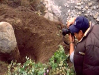 有一天,船开到链子溪北岸的时候,郑云峰真的踏上了一条危险的古道,在那里拍摄古栈道的镜头。还没走几步,就觉得太危险了:那古栈道离江面有十几层楼高!在那里可以看到两排纤痕,上面一排是纤夫扣手,下面一排有着一个一个的小坑。这些小坑都光滑得很,显然是给磨出来的。郑云峰想象当年纤夫背船行走的时候,脚正好蹬的那个部位,就磨出了这样的一个一个坑。虽然郑云峰也走了不少江岸古道,但眼前这个实在太危险了:举目接青天,俯身临江流。是继续前行还是就此止步呢?郑云峰现在站到了最能够体现三峡纤夫们的生活中心。多少人、多少代纤夫就是这样走过来的,这就是他们走过来的路呀!或许,哪一位纤夫抓滑了手,一下就掉进江里死了。郑云峰在跨出另一个大坑时稳了稳身子,把照相机甩在了背后,贴着岩石像壁虎爬墙一样一点一点往前走,用手扒着岩缝,用脚踩在石坑上。在这个位置上根本不敢望下看,就是用手死死地抓住岩缝,用脚蹬稳,就这样一步一步地过去。也就是在这个时候,郑云峰体会到了人跟自然的复杂难言的关系。人并非是为了要征服自然而生存,但人应当在自然面前表现出人类应有的精神,一种自强不息的精神,这正是三峡的精神所在。如果说三峡人创造了这样可歌可泣的历史,那么,这样具备人文价值的东西难道不值得留恋、不值得记录和保存下来吗?