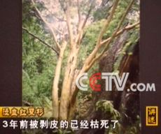 红豆杉被剥了皮后,刚开始裸露的树干是白亮白亮的,树叶还是青的;时间稍长后,树叶就发黄变红;继而树枯死树干变黑,树叶子也就全没有了。那时,山里到处都是背筐挑担持刀的剥树皮者和就地晾晒的树皮;被剥了皮的红豆杉,像没穿衣服的人一样在风中瑟瑟发抖。