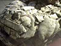 这里是商代的一个车马祭祀坑,虽然已经在地下埋藏了上千年,我们仍然可以感受到他们的神秘与威严。商代的马车不单供王宫贵族使用,也用于运输和征战。考古学家告诉我们,小屯的宫殿区内有宽阔的大道,而且这些大道以经济地区向四面八方延伸,车道宽达8.3米,大型车辆可以并行。殷墟甲骨文中,有“行”“柝”和“车”的象形文字。“行”字就形象的反映了都城内道路发展变化的基本面貌。道路纵横交错,弯道由死角改为圆弧角,路边缘发现有夯实的痕迹。路面用鹅卵石铺砌,由此可见商代晚期的道路建筑艺术。以殷墟为中心的商王朝的经济地区已经有方圆数百公里,周围更有许多臣服商王的大小番国。殷墟出土的中国最早货币贝壳和占卜使用的龟板,大都是沿海的番国所供奉。如商代发达的青铜冶炼所需锡矿来自于遥远的南方,而出土的许多精美玉器,其原料则是来自河南南阳及至新疆和阗,这无疑证明了3000多年前的商代就有了一条通往祖国新疆和湖广一带的金石之路,它要比著名的丝绸之路早1200多年。