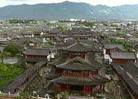 由于古城坐落在西北方向狮子山的怀抱里,东北方向的金虹山和象山挡住了玉龙雪山的寒风,使得古城夏无酷暑,冬无严寒,春秋温爽,年平均气温12.6度。从地图上看小城分为三个部分,城北以四方街为中心,元明清以来一直是繁华商业区;城东曾是清代流官府衙,现已荡然无存,只留下文庙和武庙;城南土司木府,是小城的政治经济和权力的象征,尽管它只是一座土司的宅院,但它的奢华与恢弘并不亚于任何一座王公贵胄官邸。古城曲折有致的古老街巷,把一座座古朴民居连成一片,形成了主街伴河、小巷临水、跨河筑楼的独特景观,构成了人与自然和谐统一的空间。