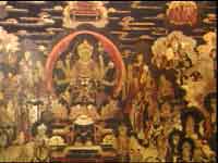 白沙壁画,因处在丽江白沙而得名。壁画绘制于明初到清初,先后延续了三百多年。大宝积宫正壁的无量寿如来会,面积达18.29平方米,是壁画中最大和最具代表性的一幅。它把汉传佛教、藏传佛教、道教的神像绘制在一幅壁画中,这种多种宗教或同种宗教中的不同流派融合并存的现象并不多见。突出体现了纳西多元文化相融的特点。白沙壁画,色彩富丽,造型准确,工笔严谨,有着浓郁的民族特点和地域特色。从绘画技巧上,我们可以看出,壁画的作者群来自不同的民族,有纳西的东巴画家,有西藏和四川的藏族喇嘛画家,江南汉族画家马肖仙和中原道教画家张道士等。因此在艺术上表现为东巴画风格与多民族画风格揉合的特点。