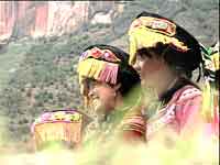 戴“五福冠” 的老人,纳西人称他为“东巴”,是东巴文化的传承者。东巴文化是纳西族的传统文化,以古老的图画象形文字为主要记录方式而存在于民间的独特文化形式。东巴文化形成于唐宋时期,已有上千年的历史,东巴文化的核心是崇尚自然,其中最见纳西先民心灵睿智的一个内容是人与自然是兄弟的思想,人与自然应该互敬互爱,和睦相处,才能相安无事,才能维持一切生命的延续,这也是纳西人对生命内涵认识的要素之一。在古老的东巴文化宝库中,保留着古曲、舞蹈、绘画,各种形式交相辉映,体现了纳西人的生态观、生命意识、朴素的哲理和艺术上的造诣,这种多元文化丰富博大,因此被很多学者视为解开喜马拉雅周边地区、各民族的文化传播、原始宗教、藏传佛教前本教文化之谜的一把钥匙。“东巴”是什么意思?“东巴”的意思就是“智者”,大智大慧。他们是纳西族本民族自己教育、自己培养的知识分子,大智大慧的人。我们靠他们书写的东巴文化和东巴经典把纳西族古代的文化作为一个百科全书,作为一个精神武库,作为一个思想博物馆完整地保存到现在,所以我们感谢他们。