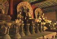 片子当中我们看到一尊大佛,是千手千眼佛,这是一个宗教的传说,不知道你注意没注意,二十三米高的一个大佛头上边,坐了一个一米五的一个小佛,坐佛是谁呢?就是无量寿佛。观世音是无量寿佛的学生,这个故事讲的就是这段历史。观世音在成佛以前,发誓要把所有的人都渡到极乐世界去,要普渡众生,可是他渡着渡着就发现,人的私心杂念太多,一个人忙不过来,他就产生了一个厌世的情绪,茫茫众生,愚昧者太多,靠我一个人不行。他想到这儿以后,他的身体整个就碎了,他的理念没有了。信仰崩溃了,身体也就跨了。变成了四十片。这时候他的老师来了,用手抚摸着他的头顶,他虽然已经变了片儿了,但还有头。只要你的信念在,终究还是可以把这些人渡到西天极乐世界去的,他说到这儿的时候,四十片身体喀嚓就回来了,又变成他的肉身,重新组合起来了,就生出来四十片胳膊,按照佛教的教义,四十乘二十五是一千。四十个胳膊,每只手上有一只眼睛,实际是千手千眼。他的老师就坐在他的头上。